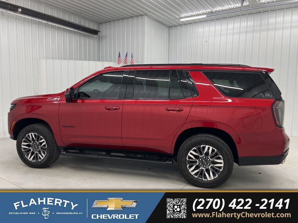 Radiant Red Tintcoat 2025 Chevrolet Tahoe Z71 4WD 10-Speed Automatic with Overdrive EcoTec3 5.3L V84WD, Black Leather.Odometer is 24767 miles below market average!Home of the Powertrain Advantage Program, Flaherty Chevrolet in Brandenburg, KY is your trusted Chevrolet dealer. Serving drivers across Louisville, Mt. Washington, Elizabethtown, Glendale, Radcliff, Corydon, Bardstown, Lexington, Owensboro, Bowling Green, Cincinnati, Indianapolis, and Nashville. For over 50 years, our family-owned Chevrolet dealership has been helping car buyers find the perfect vehicle, whether you’re shopping for a new Chevrolet or a dependable selection of used cars, trucks, and SUVs. Backed by a 4.8/5 customer satisfaction rating, we’re also home to a full Chevrolet service center, certified auto repair, genuine Chevrolet parts, and flexible auto financing. Conveniently located between four major cities, Flaherty Chevrolet makes it easy for Kentucky, Indiana, Ohio, and Tennessee drivers to shop for new Chevrolets, quality used cars, and expert Chevrolet service all in one place.